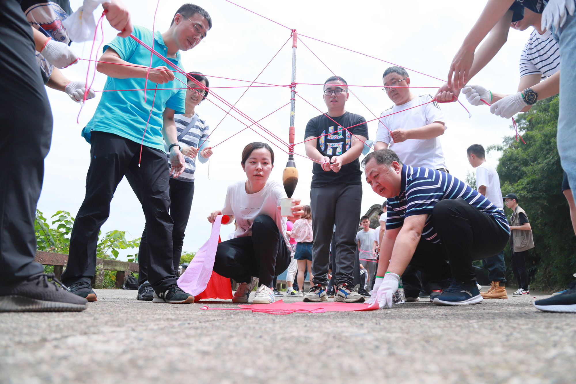 “人心齊,泰山移”。在“書寫傳奇”環(huán)節(jié),小組每個(gè)成員拉住綁有大毛筆的繩子末端,通力協(xié)作配合完成指定書寫文字,深刻啟發(fā)大家在工作中不僅要做好崗位工作,恪盡職守,還有學(xué)會(huì)合理分工,靈活變通,營(yíng)造互幫互助、唇亡齒寒的全局觀念,為了團(tuán)隊(duì)目標(biāo)最終達(dá)成及時(shí)協(xié)作調(diào)整、鍥而不舍。“流血流汗不流淚,掉皮掉肉不掉隊(duì)”。在“飛奪瀘定橋”環(huán)節(jié),教練給各組分發(fā)隊(duì)員人數(shù)一半的泡沫墊,要求從起點(diǎn)出發(fā),借助泡沫墊且腳不觸地的情況下,全組隊(duì)員“一個(gè)都不能少”全數(shù)到達(dá)終點(diǎn)。各小組以斷金碎石的精神,堅(jiān)定信念,持續(xù)超越;在無障礙溝通的氛圍中感受眾人合力,不斷突破,熔煉團(tuán)隊(duì)。