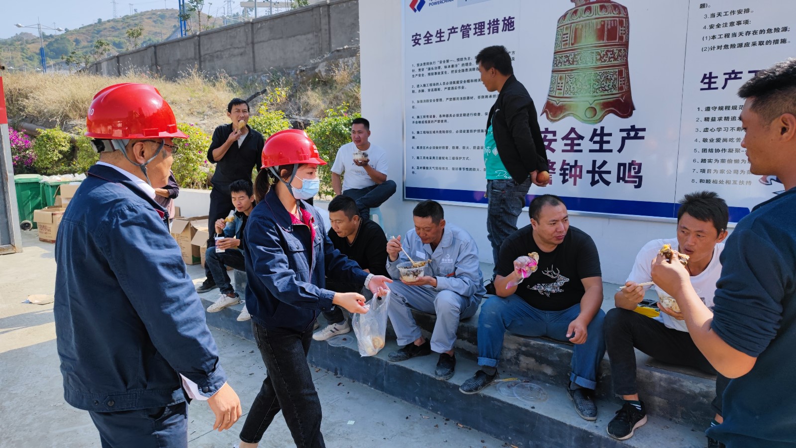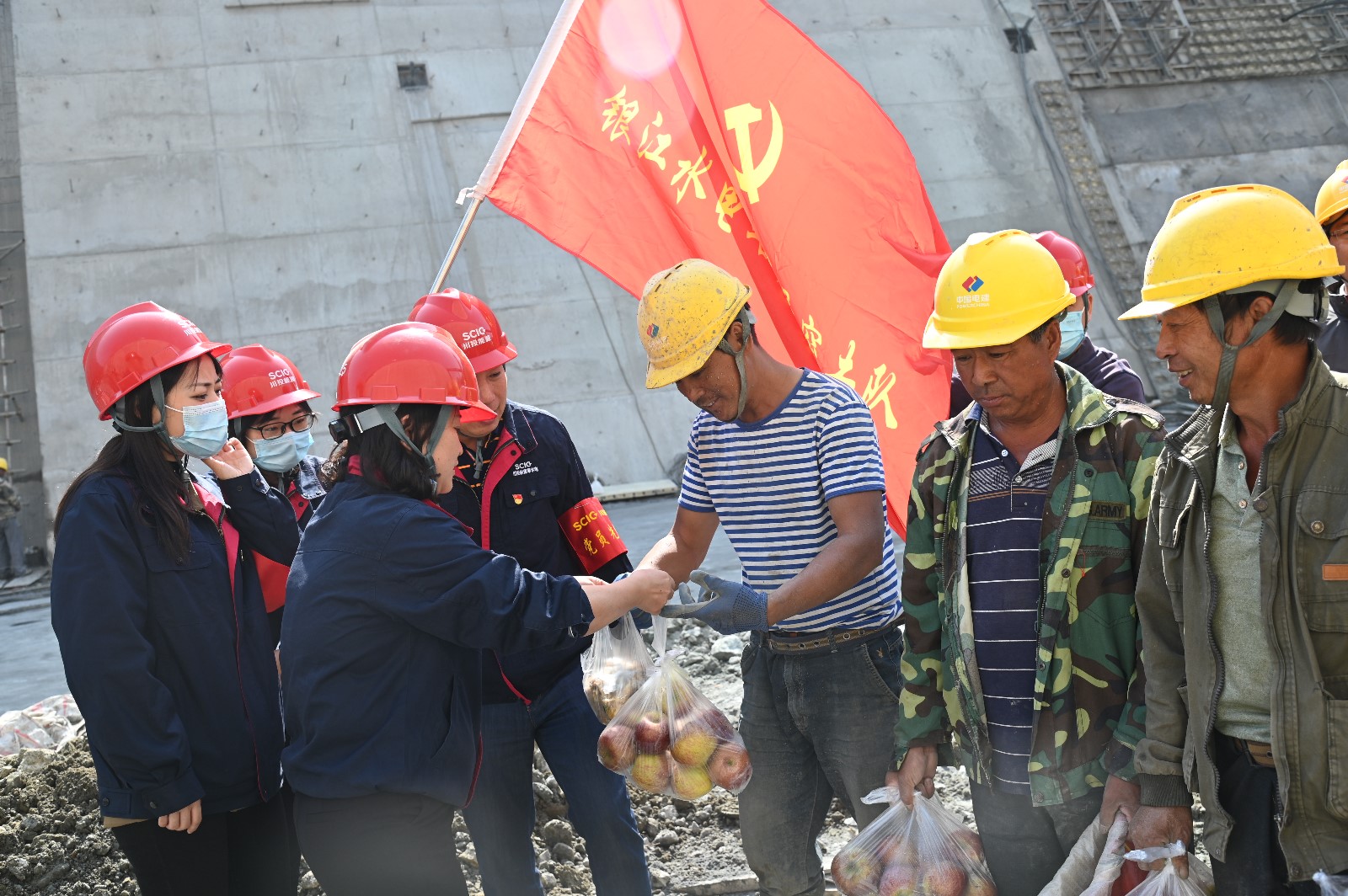 通過(guò)近日對(duì)施工班組的了解,為確保大江截流的目標(biāo)按期實(shí)現(xiàn),工人們中午、晚上用餐都是送到施工現(xiàn)場(chǎng)簡(jiǎn)單解決,11月9日,機(jī)關(guān)第一黨支部組織了以“工人在加班,我為工人送加餐”的主題黨日活動(dòng),組織支部黨員、預(yù)備黨員、入黨積極分子、志愿服務(wù)者共15人到導(dǎo)流明渠施工現(xiàn)場(chǎng),慰問(wèn)在施工現(xiàn)場(chǎng)加班加點(diǎn)的一線(xiàn)工人,為他們送去了雞腿、蘋(píng)果等慰問(wèn)品。
