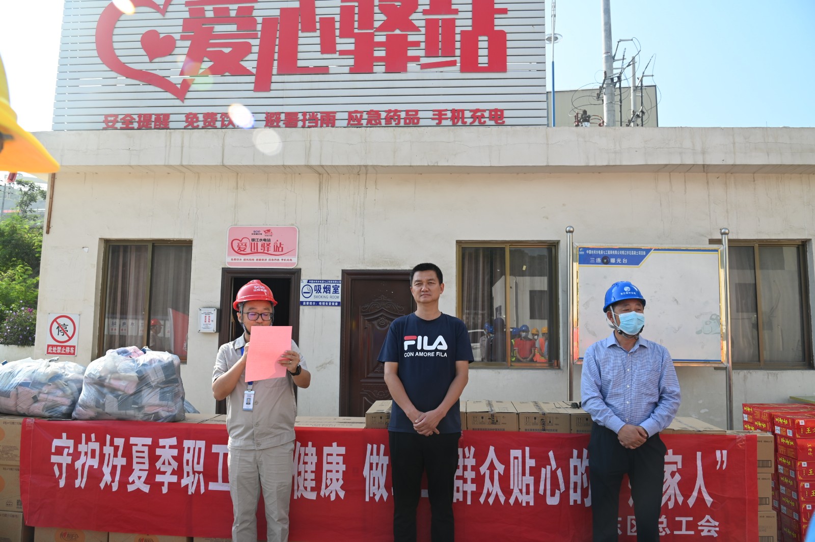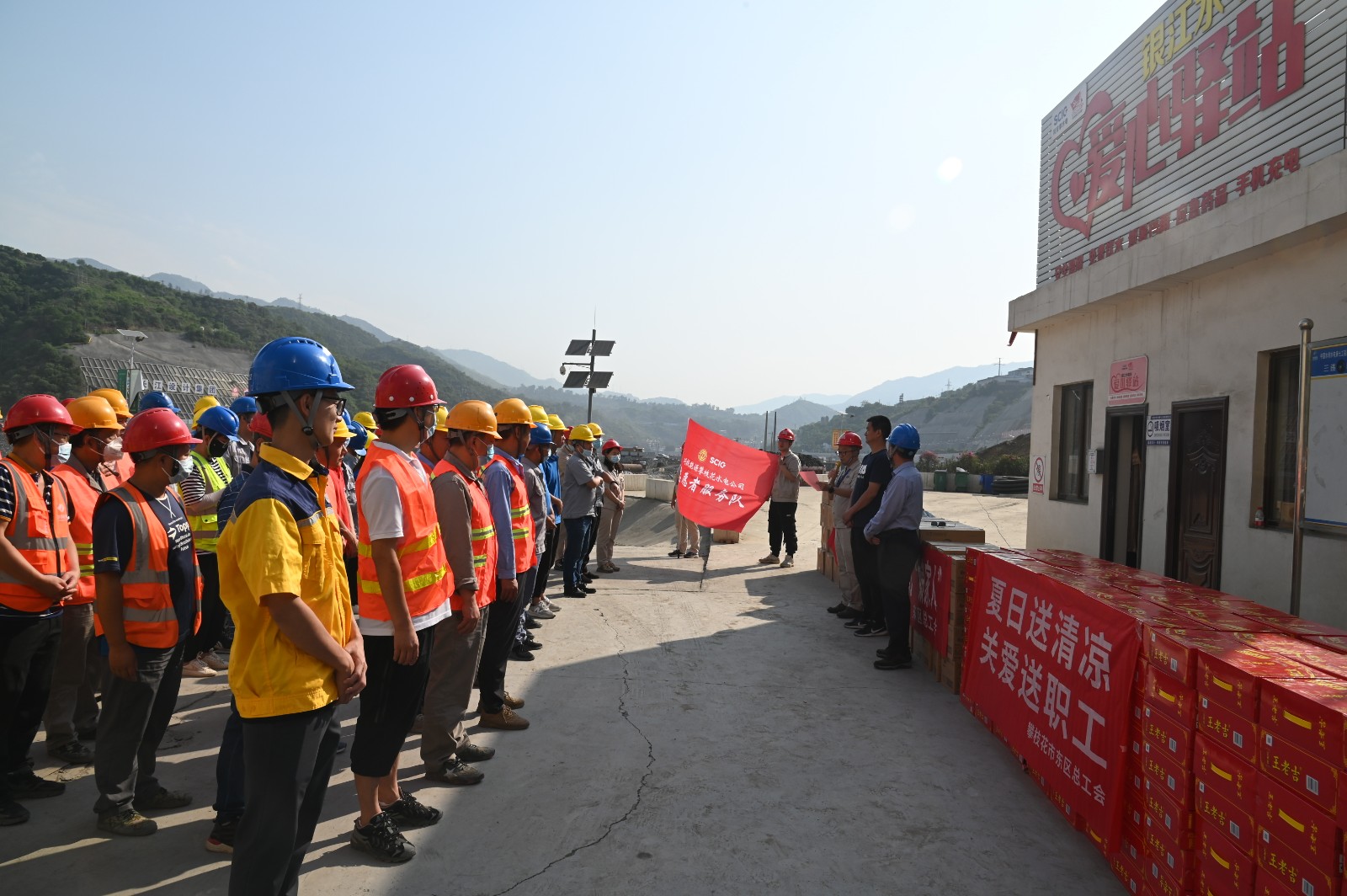 雖然是上午9點,但盛夏的烈日已炙烤著銀江水電站工地。在銀江水電站“愛心驛站”,汪慶元首先致敬全體工友烈日下的“銀江精神”,高度贊揚了一線建設者三年來為銀江水電站建設做出的積極貢獻,并鼓勵他們要戰(zhàn)勝高溫酷暑等重重難關,堅守崗位完成工程建設任務。劉欣在講話中談到:東區(qū)工會心系工友,是大家的“娘家人”,希望大家保重身體,平安度夏,在落實安全防護的前提下積極工作,保質(zhì)保量推進項目施工,為攀枝花的經(jīng)濟建設做出更大的貢獻。