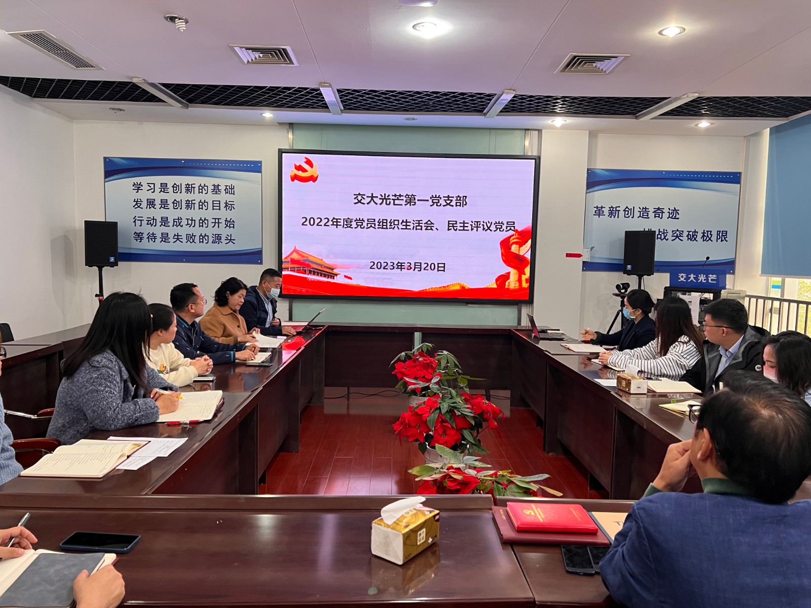 3月20日,按照黨總支工作部署要求,交大光芒第一黨支部召開了2022年度組織生活會并開展民主評議黨員。公司黨總支書記、總經(jīng)理劉成輝到會督導并點評。第一支部書記、公司副總工程師兼研發(fā)中心副總經(jīng)理王輝博士主持會議。黨總支委員汪志橋按照雙重組織生活要求,以普通黨員身份參加支部組織生活會。