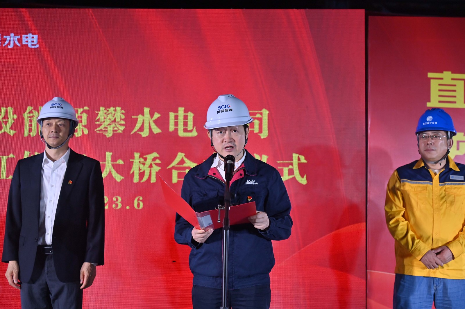 當前正值川投能源深入開展學習貫徹習近平新時代中國特色社會主義思想主題教育的時期,攀水電黨總支以高度政治責任感扎實推進主題教育走深走實,確保學用結合取得實效。2023年6月15日,夜晚的銀江大橋施工現(xiàn)場燈火璀璨,連續(xù)幾天超過40℃高溫的攀枝花迎來了難得的涼爽天氣,攀水電公司組織開展了金沙江銀江大橋合龍儀式,川投能源黨委副書記、工會主席冉蘭平,黨委委員、副總經理、總法律顧問楊平,川投能源副總經理、攀水電公司黨總支書記、董事長徐孝剛出席儀式,儀式由攀水電公司黨總支副書記、總經理吳巍嶼主持。公司相關領導及參建單位共計50余人參加儀式。