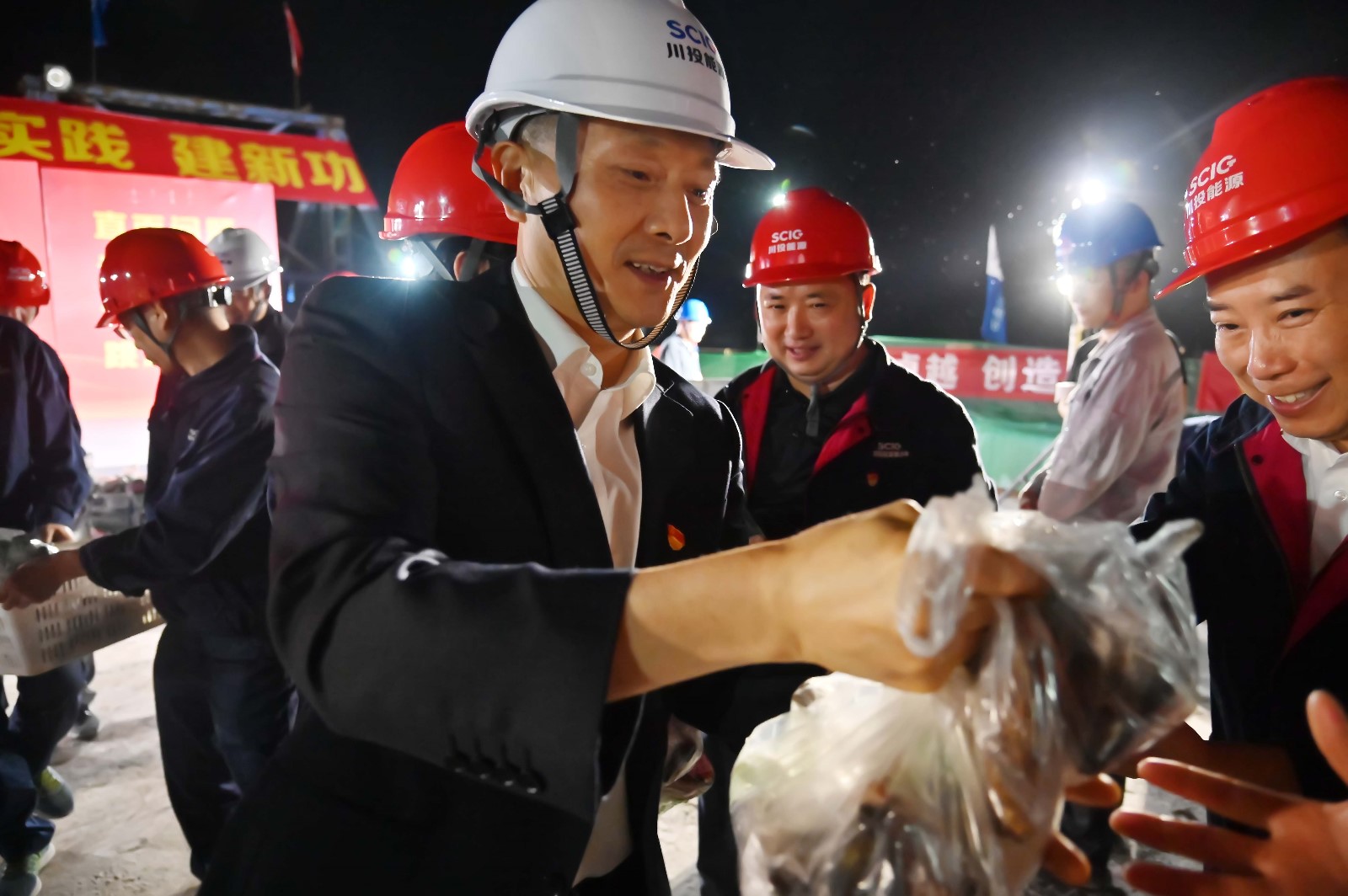 儀式開始前,受川投能源黨委書記、副董事長、總經理楊洪委托,冉蘭平一行慰問了挑燈夜戰(zhàn)在銀江大橋的一線工友們,把熱乎乎的雞腿、粽子、咸鴨蛋、牛奶等送到一線人員的手中。