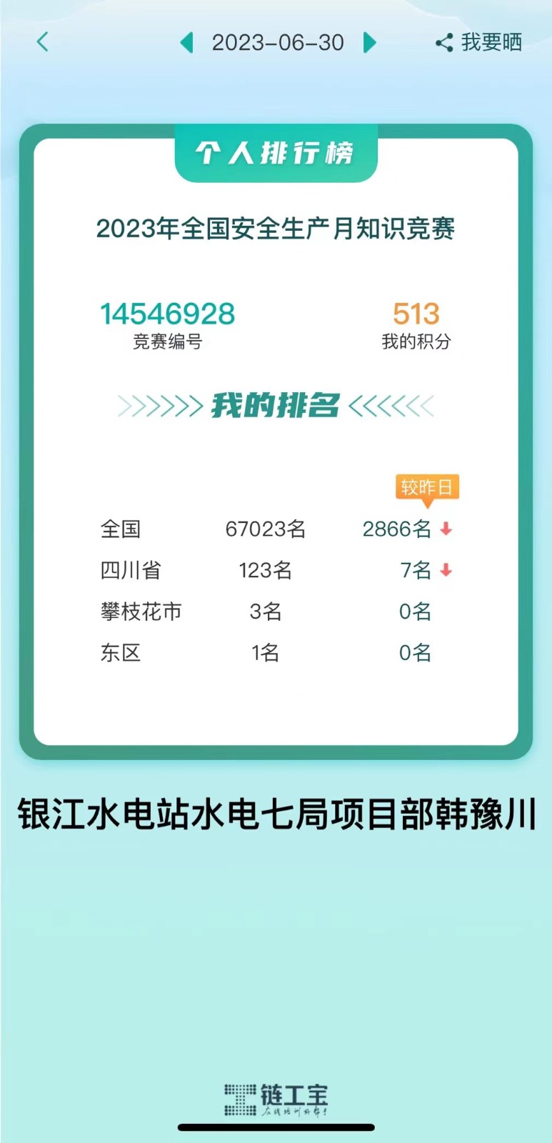 在“鏈工寶”2023年全國安全生產(chǎn)月知識競賽活動中,攀枝花市前10名中,銀江水電站占3人,東區(qū)前10名中,銀江水電站占6人,有效檢驗了安全生產(chǎn)月活動成果,充分體現(xiàn)了銀江水電站學(xué)安全、講安全的濃厚安全生產(chǎn)氛圍,進(jìn)一步強(qiáng)化了廣大工程參建人員的安全生產(chǎn)意識。
