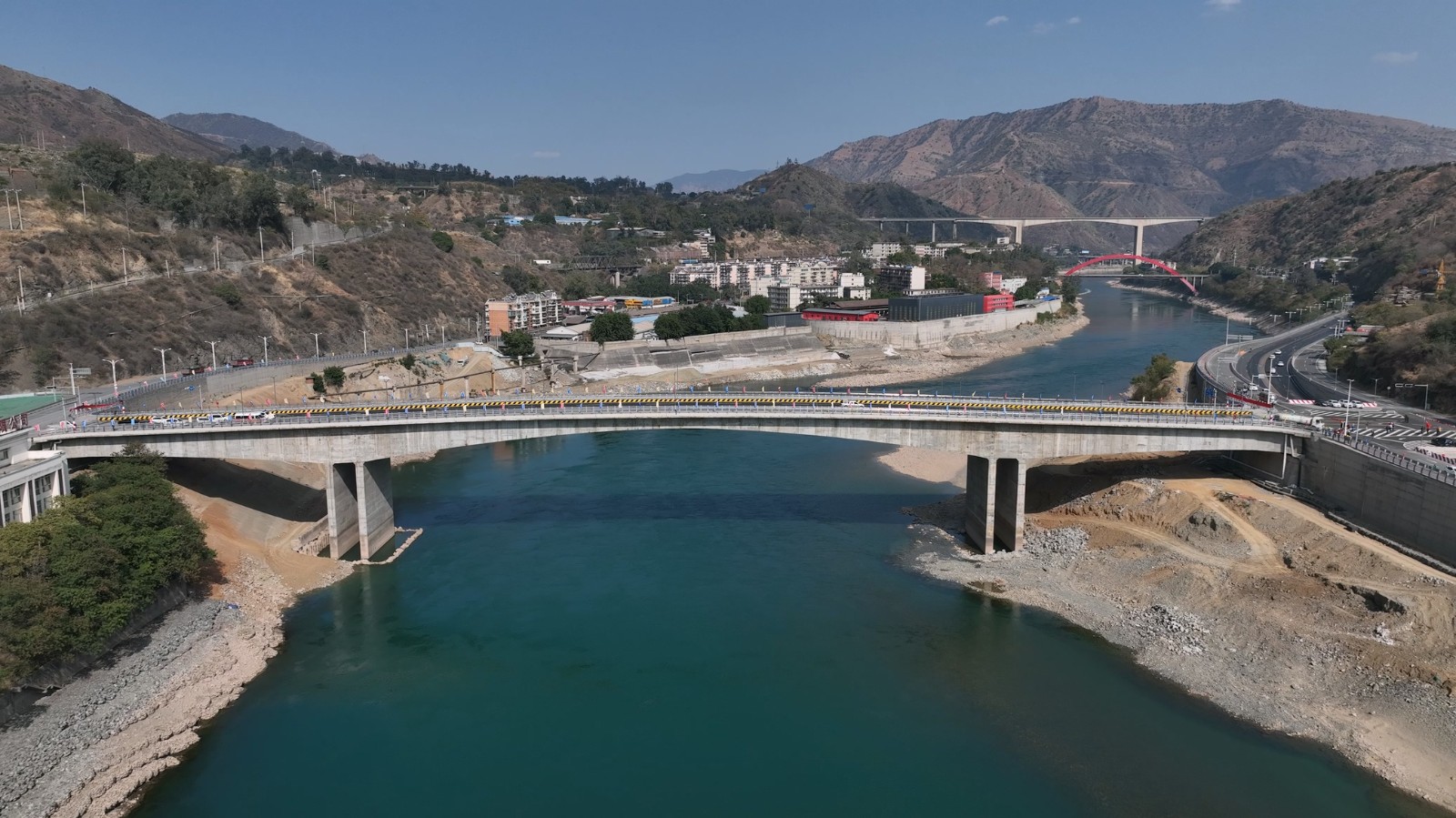 銀江大橋距銀江水電站大壩下游1km處,為雙向四車道預(yù)應(yīng)力混凝土連續(xù)剛構(gòu)橋,全長272m,橋梁寬度23m,左右岸與主橋采用“左岸平交+右岸框架涵立交”的銜接方式。銀江大橋是銀江水電站的重要附屬工程,也是地企共建的民生工程,大橋建成后將成為連接兩岸的重要交通橋,起到加強金沙江南北兩岸快速通道的紐帶作用以及推動城市擴容提質(zhì)、不斷提高城市承載能力和輻射帶動作用,將為攀枝花市共同富裕試驗區(qū)建設(shè)貢獻積極力量。