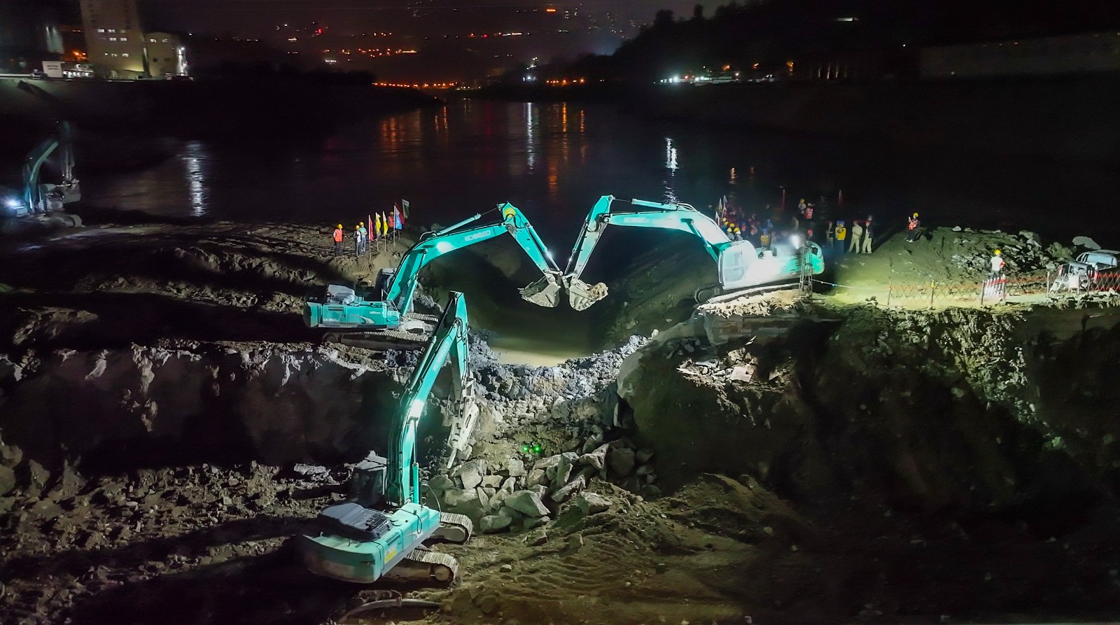 金秋十月,川投能源銀江水電站工程建設(shè)“進(jìn)度條”持續(xù)刷新。10月25日晚上,隨著川投能源副總經(jīng)理、導(dǎo)流明渠截流指揮長(zhǎng)徐孝剛一聲令下,十余臺(tái)挖掘機(jī)在二期上游圍堰右岸進(jìn)行破口開(kāi)挖,奔騰的金沙江水隨即涌入主河床廠(chǎng)房與溢流壩上游,充水平壓后江水經(jīng)溢流壩段流向下游,銀江水電站成功實(shí)現(xiàn)分流。這一重要進(jìn)展為按期完成導(dǎo)流明渠截流打下堅(jiān)實(shí)基礎(chǔ),也標(biāo)志著銀江水電站首臺(tái)機(jī)組投產(chǎn)發(fā)電正式進(jìn)入倒計(jì)時(shí)階段。