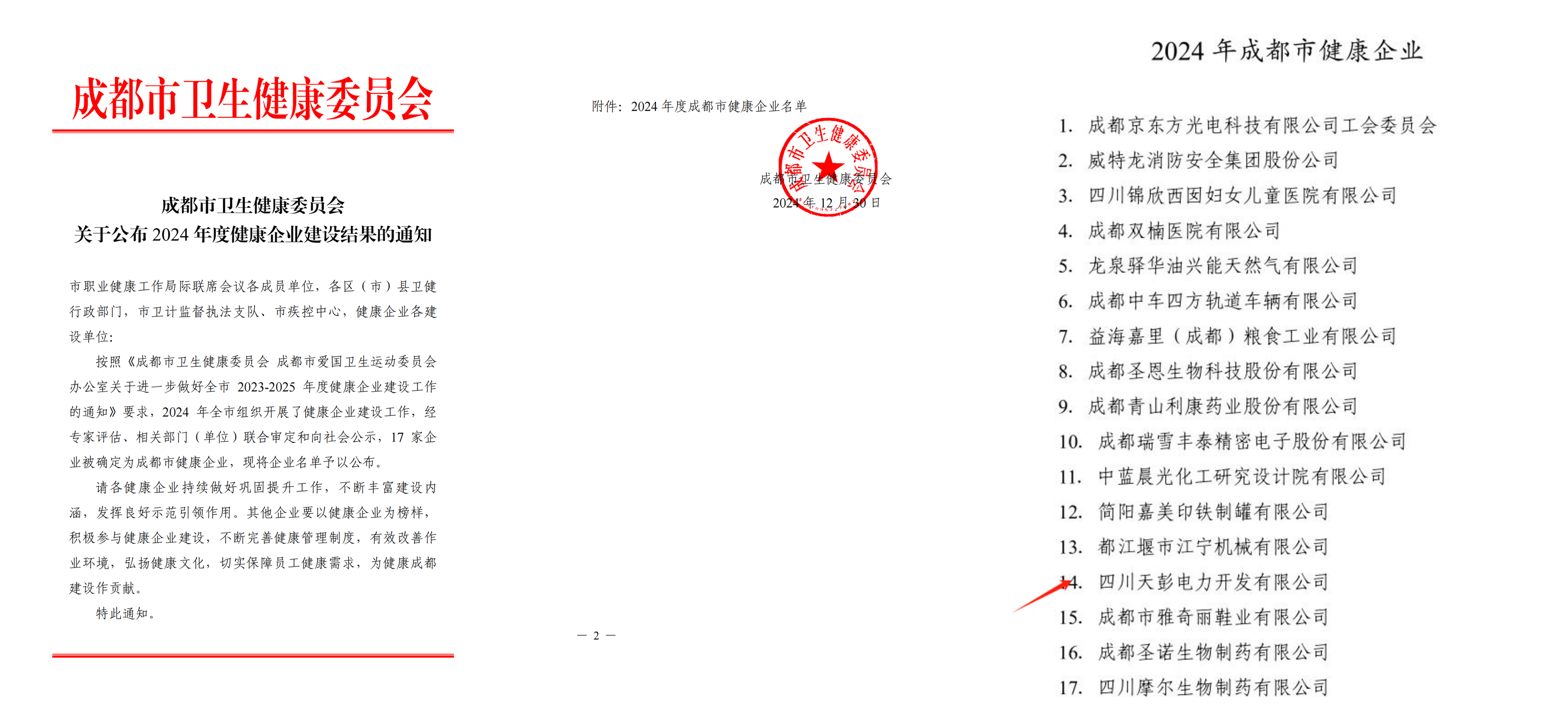 近日,成都市衛(wèi)生健康委員會(huì)公布2024年度健康企業(yè)建設(shè)結(jié)果,天彭電力公司順利通過(guò)專(zhuān)家組評(píng)審驗(yàn)收,被評(píng)為“2024年成都市健康企業(yè)”。