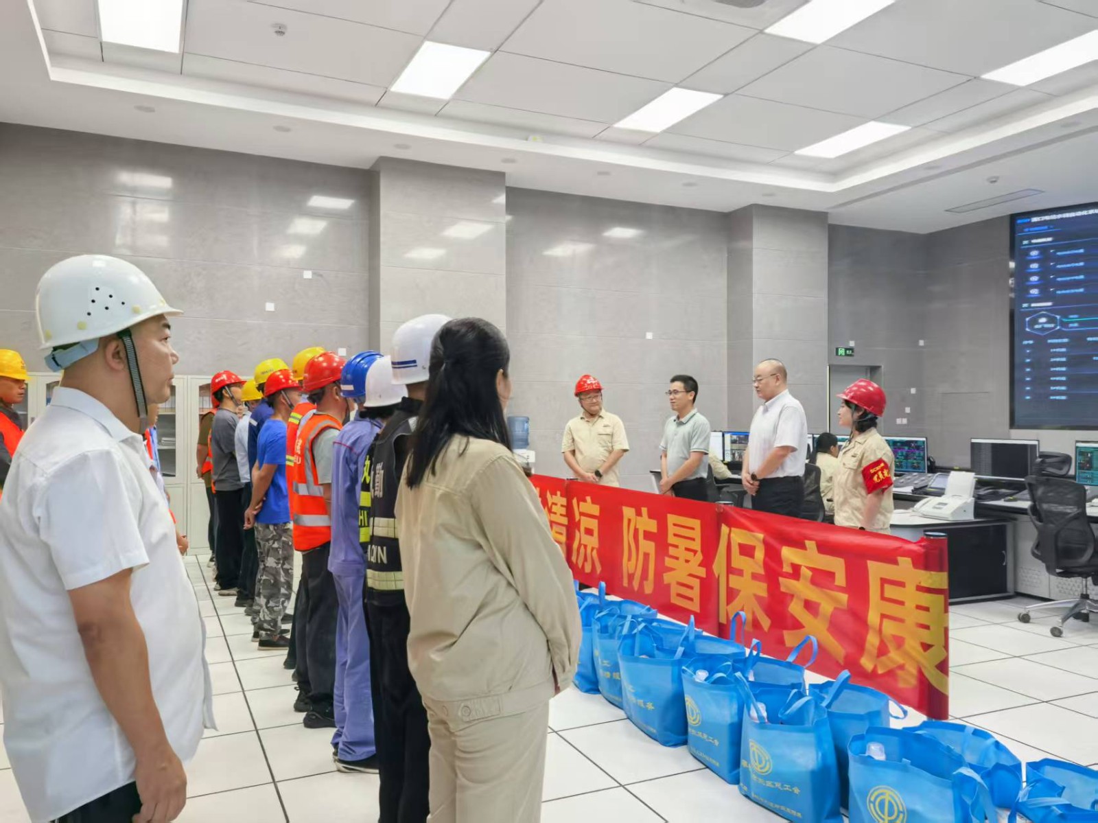 慰問現(xiàn)場(chǎng),張平首先向銀江水電站一線人員表示親切的問候,對(duì)大家在高溫酷暑下堅(jiān)守崗位、辛勤工作的精神表示高度的贊揚(yáng),叮囑大家一定要保證安全建設(shè)、安全生產(chǎn),全面做好各類防護(hù)措施,注意自身安全和健康。希望攀水電公司能夠繼續(xù)發(fā)揚(yáng)優(yōu)良傳統(tǒng),牢固樹立以人為本的理念,壓實(shí)安全管理責(zé)任,認(rèn)真落實(shí)安全生產(chǎn)月活動(dòng)要求,密切關(guān)注氣象預(yù)警,嚴(yán)格執(zhí)行高溫天氣作業(yè)規(guī)定,切實(shí)維護(hù)廣大職工的勞動(dòng)安全健康權(quán)益,做好防暑降溫服務(wù)工作,在銀江水電站形成人人抓安全、人人擔(dān)責(zé)任的良好氛圍,切實(shí)筑牢安全生產(chǎn)防線。