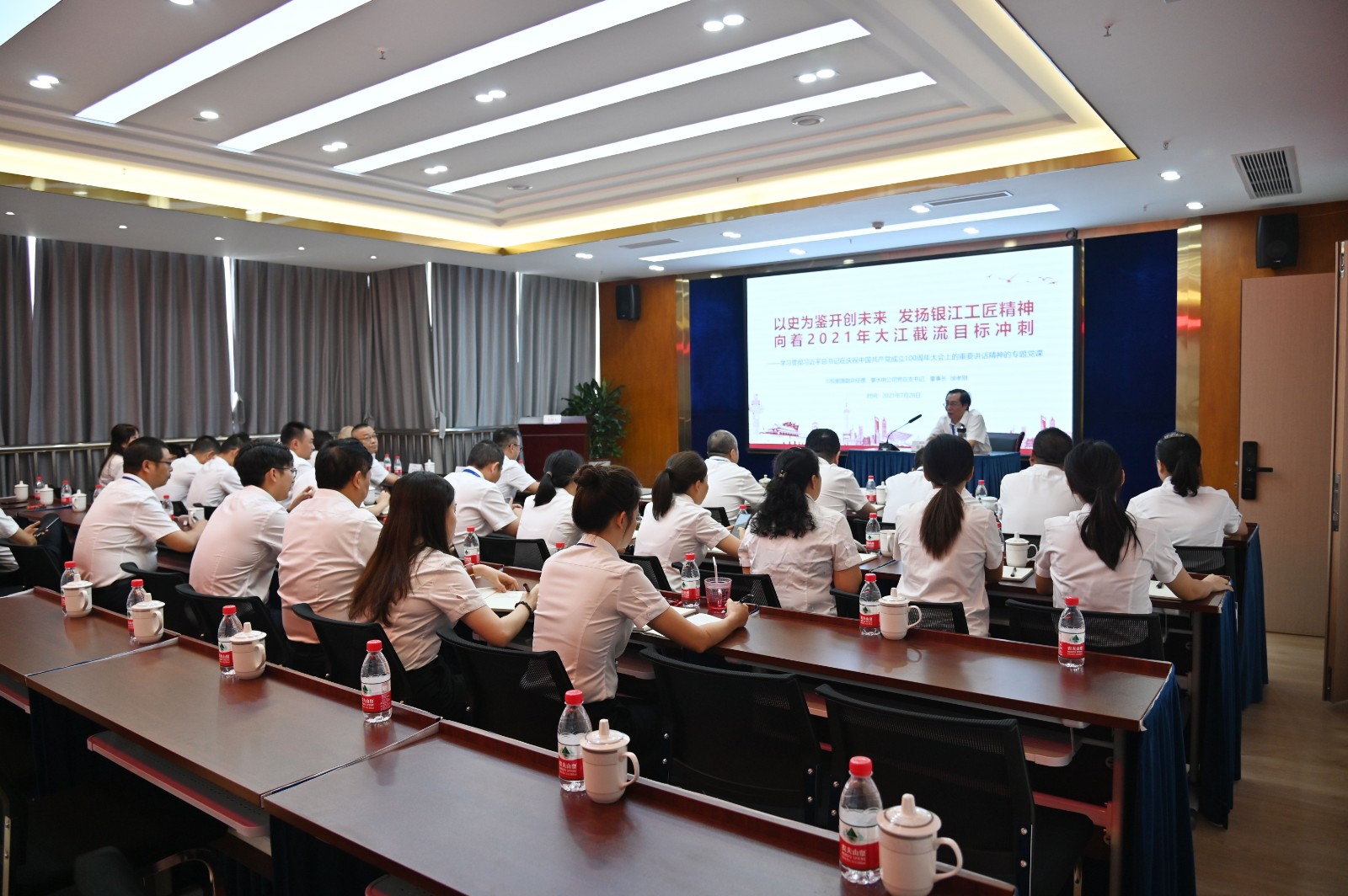 簽約儀式后,川投能源副總經(jīng)理、公司黨總支書記、董事長(zhǎng)徐孝剛做了題為《以史為鑒開創(chuàng)未來(lái),發(fā)揚(yáng)銀江工匠精神,向著2021年大江截流目標(biāo)沖刺》的專題黨課,帶領(lǐng)大家學(xué)習(xí)貫徹習(xí)近平總書記在慶祝中國(guó)共產(chǎn)黨成立100周年大會(huì)上重要講話精神。他表示,距離大江截流的倒計(jì)時(shí)越來(lái)越近,本次“師帶徒”簽約儀式,一是深入領(lǐng)會(huì)習(xí)近平總書記的重要講話精神,從黨史中汲取推動(dòng)工程建設(shè)和公司高質(zhì)量發(fā)展的強(qiáng)大動(dòng)力;二是傳承工匠精神,培育銀江工匠文化,激勵(lì)全體銀江建設(shè)者朝著既定目標(biāo)前進(jìn),向著大江截流沖刺;三是廣泛培養(yǎng)銀江建設(shè)者的創(chuàng)新意識(shí),建設(shè)知識(shí)型、技能型、創(chuàng)新型水電建設(shè)大軍,最大程度激發(fā)各參建單位的創(chuàng)新才能。