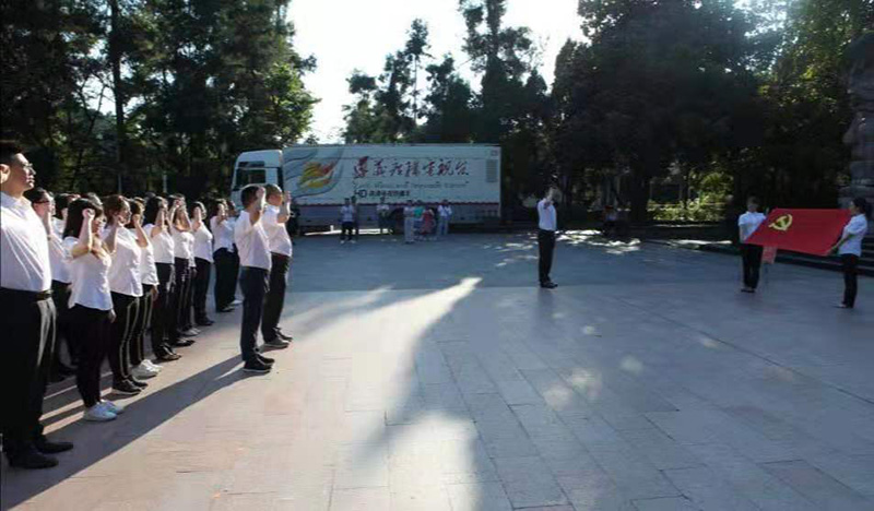 在紅軍山烈士陵園“紅軍烈士永垂不朽”紀(jì)念碑前,全體人員向紅軍烈士敬獻(xiàn)花籃、鞠躬致敬,表達(dá)對革命先烈的崇敬緬懷之情。由公司紀(jì)委書記冉蘭平領(lǐng)誓,面對黨旗重溫入黨誓詞,鏗鏘有力的莊嚴(yán)誓言激蕩在每個黨員心中。